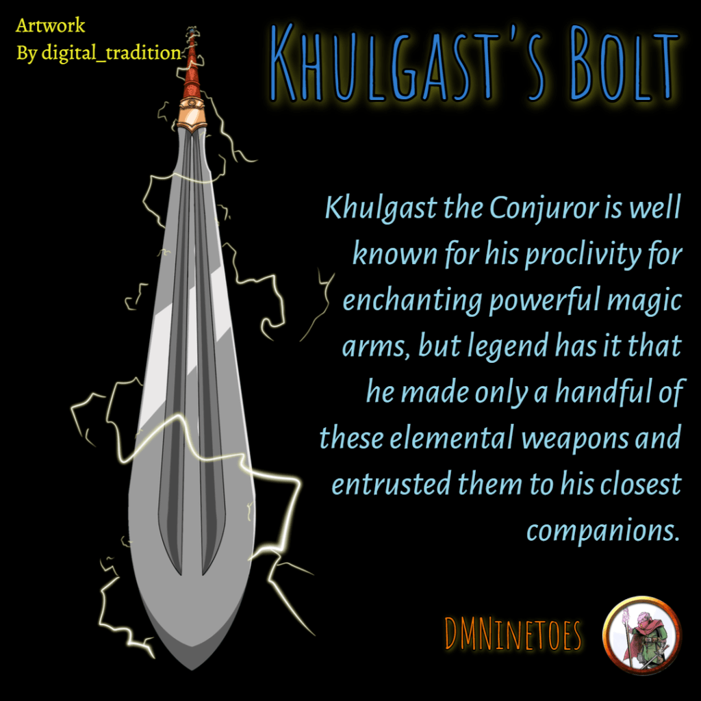 Khulgast’s Bolt Khulgast’s Bolt. A powerful sword of storm and light. Khulgast’s Bolt Share this: Click to share on X (Opens in new window) X Click to share on Facebook (Opens in new window) Facebook Like Loading... Related