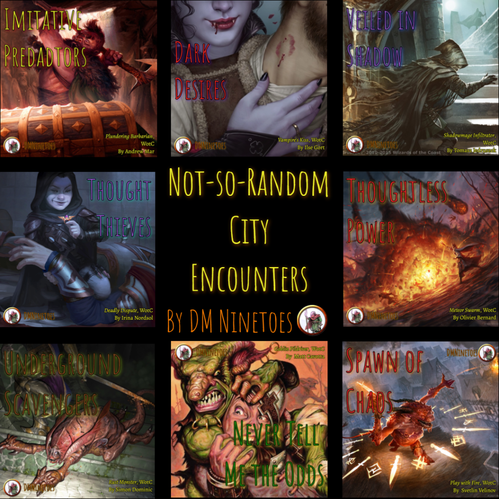 Not-so-Random Encounters is a 5th Edition supplement for 3-7 characters of 7th-level and is optimized for four characters with an average party level (APL) of 5 or 8. This document offers details for each level and makes adjustments accordingly. This supplements provides a dozen random encounters for any dungeon setting.
